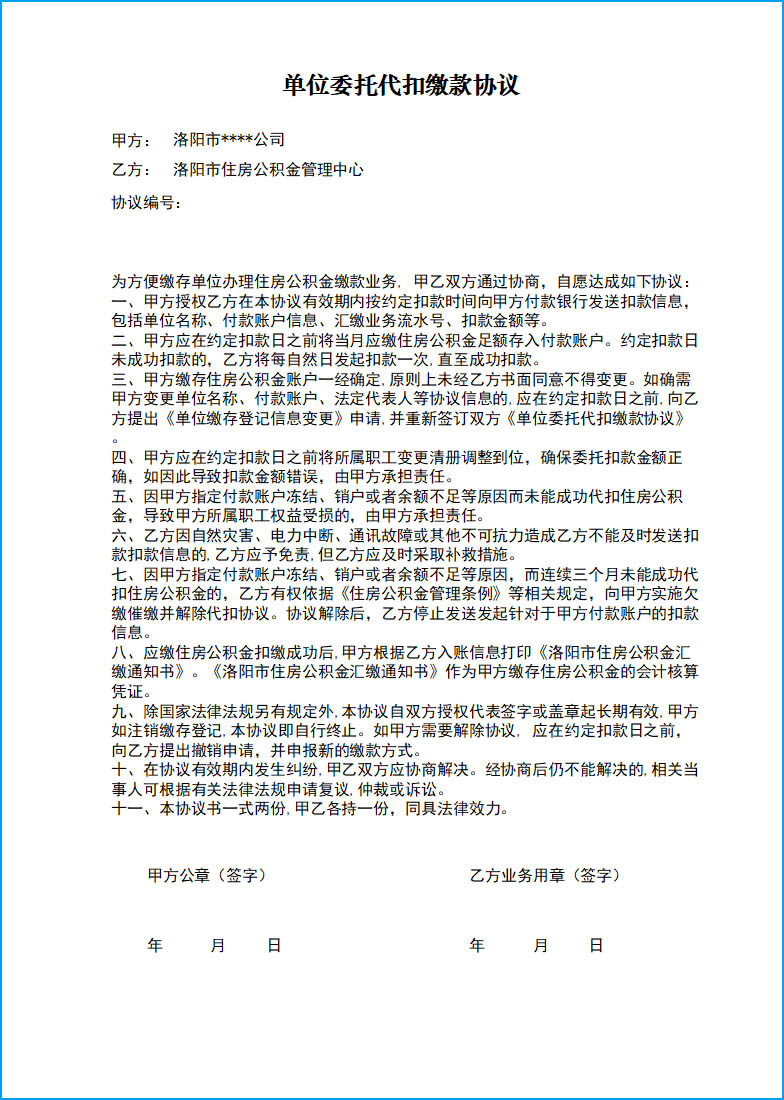 1. 单位填制《洛阳市住房公积金单位委托代扣缴款申请表及协议》一式两份,加盖单位公章。